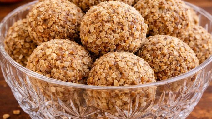 Mešajte dok ne dobijete kompaktnu smesu od koje možete formirati kuglice. Rukama pravite male kuglice i uvaljajte ih u mleveni keks ili orahe.