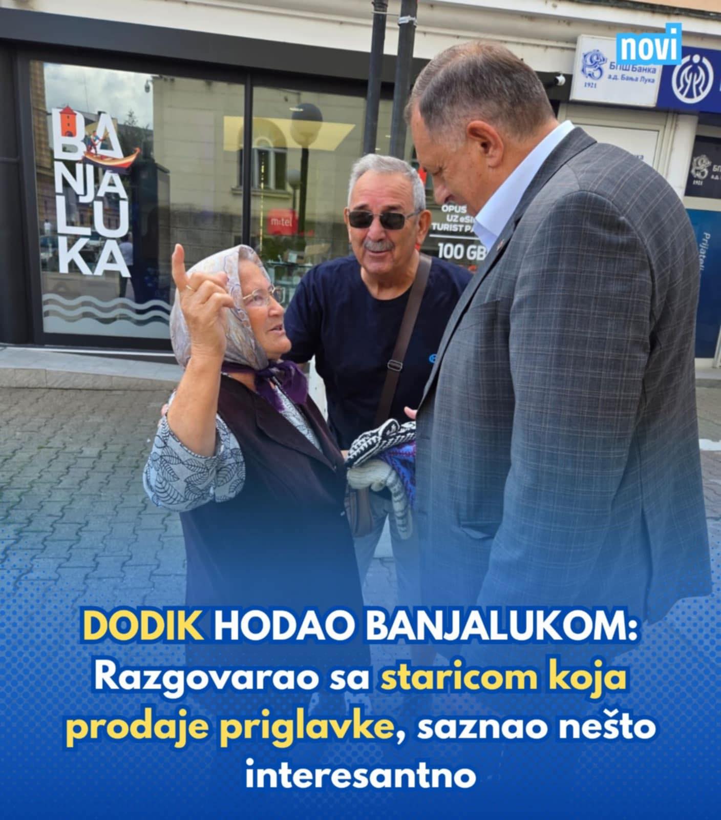 Predsjednik Republike Srpske Milorad Dodik prošetao je danas Banjalukom što je iskoristio da porazgovara sa građanima, kao i sa jednom staricom koja prodaje priglavke, pišu Nezavisne.